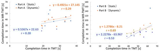 Figure 5 shows the completion times of the TMT and MR-TMT for each subject. A weak positive correlation was observed between the completion times of TMT Part A and MR-TMT Part A, with correlation coefficients of 0.28 for the static task and 0.29 for the dynamic task. In Part B, the correlation coefficient between the TMT and MR-TMT static tasks was 0.53, whereas that between the TMT and MR-TMT dynamic tasks was 0.69, indicating positive correlations. These results indicated that subjects with longer TMT completion times tended to have longer MR-TMT completion times.