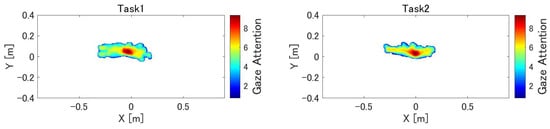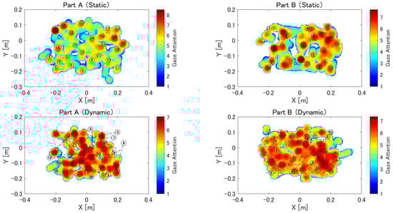 Figure 6 shows the heat maps that quantitatively represent the subject’s gaze during task performance. These are the data obtained from one of the ten subjects. The numbers and hiraganas in the figure correspond to the object locations in the task. In the heat map of the dynamic task, the initial object position is indicated, and the black dashed line indicates the trajectory of the object as it moves. Overall, the static task causes a red area around the object, whereas the heat map of the dynamic task causes the entire area to appear red.