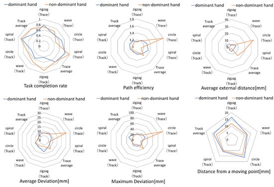 Figure 7 displays the radar charts of one subject, presenting the results obtained for each evaluation index for each task. These charts display the outcomes for four object shapes (zigzag, wave, circle, and spiral) in both the Trace and Track tasks, along with the average values for each task. The color blue denotes the scores pertaining to the dominant hand, whereas orange represents the non-dominant hand. A higher value for the task completion rate indicates better performance. For the remaining five indicators, lower values indicate a better performance.