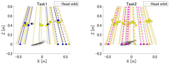 Figure 8 shows the projected directions of the ball and head trajectories generated during the experiment. The circles in the figure represent the coordinates of the palm when the ball is touched, with the color of each symbol corresponding to the color of the ball. The triangles denote balls that could not be touched; these are drawn at the intersection of the ejection direction and z = 0 m. Each dashed line represents the expected trajectory of the ball. The graph of Task 1 shows that the subject made many mistakes while the ball was flying to the right.