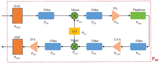 A typical model of an RF signal processing unit, also known as an RF chain, is shown in Figure 3 [14,16,21,22,23]. Specifically, on the transmitter side, the BB signal is first converted to an analog signal by the digital-to-analog converter (DAC). Then, the analog signal is filtered by the low-pass filter and upconverted by the mixer, whose output is then filtered again, amplified by the power amplifier (PA), passed through the duplexer, and finally transmitted to the wireless channel. On the receiver side, the RF signal is sequentially filtered, amplified by the low-noise amplifier (LNA), cleaned by the anti-aliasing filter, downconverted by the mixer, filtered again before passing through the intermediate frequency amplifier (IFA) that has an adjustable gain, and finally converted back to a digital signal by the analog-to-digital converter (ADC). Note that the mixers operate with the aid of the local oscillator (LO) and, among all the RF components, the PA and LNA usually have much higher power consumption than the others.