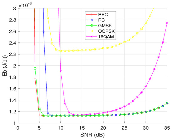 First, let us compare the EC performance of different CPM schemes and of other representative modulation schemes, such as OQPSK and 16QAM, by observing how varies with the received SNR . As shown in Figure 4, for all modulation schemes, the achievable values firstly descend and then increase with the received SNR. This is because in the low-SNR region, the number of retransmissions plays an important role, while the number of retransmissions is reduced to its minimum under a sufficiently high SNR, and then an even higher SNR means unnecessary energy wastage. In addition, for most SNRs, the achievable values of REC (, and ), RC (, and ), and GMSK (, and ) are lower than those of OQPSK and 16QAM, which verifies the advantages of CPM in terms of energy saving. The reason why a higher order CPM scheme has a lower can be explained by referring to Equation (17) as follows: (1) a larger M causes a smaller number of symbols per packet (i.e., the smaller exponent ) and a smaller (i.e., the larger base number ), thus the denominator increases with M; (2) the variable in the numerator becomes smaller when M becomes larger, while all the other terms can be regarded as constants. Furthermore, we can see that the lowest values of achieved by the four modulation schemes having (i.e., REC, RC, GMSK, and 16QAM) are almost the same, while OQPSK having achieves the largest in the high-SNR region and the second-largest in the low-SNR region. It is also observed that when the SNR is above a specific threshold, the three different CPM waveforms exhibit the same EC performance.