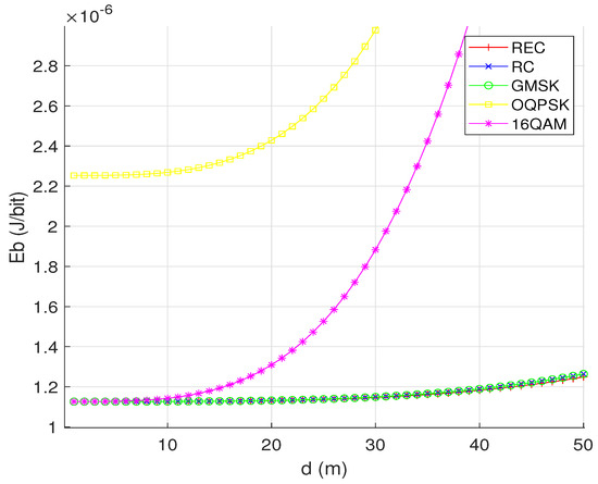Figure 5 characterizes the relationship between and the communication distance d for OQPSK, 16QAM, and the CPM signals with different pulse shaping functions. We can see that increases with d for all the modulation schemes considered. This is because large distance reduces the received SNR value under a given transmit power, thus degrading the SEP performance and increasing the number of retransmissions. We also see that all the three CPM waveforms considered have the same EC performance curves, which are consistently and significantly better than those of OQPSK and 16QAM when d is sufficiently large. Here, we assume dB for the three CPM waveforms and dB for OQPSK and 16QAM. The two SNR values are selected according to the results shown in Figure 4, where the three CPM waveforms achieve their optimal at about dB, while OQPSK and 16QAM achieve their near-optimal at about dB.