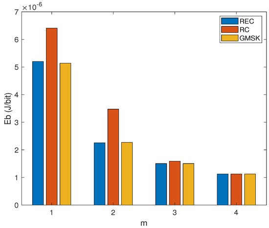 The relationship between the EC per successfully transmitted bit () and the modulation efficiency m for the CPM signals with different pulse shaping functions (REC, RC, and GMSK) over the AWGN channel, while assuming , dB and m.