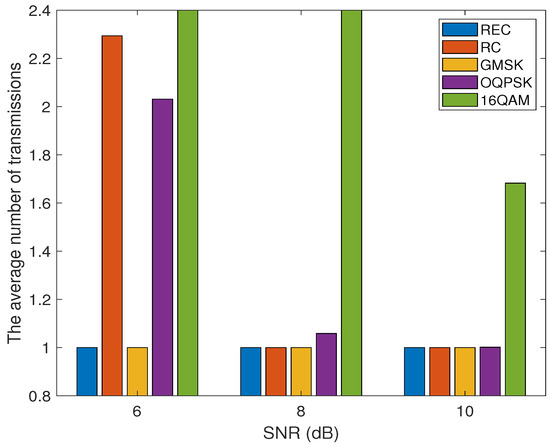 Figure 7 demonstrates the relationship between the average number of transmissions required for successfully sending a single packet and the received SNR over the AWGN channel employing different modulation schemes, including OQPSK, 16QAM, and the three CPM waveforms. Obviously, 16QAM incurs the largest , while the REC- and GMSK-based CPM schemes require the smallest , under all the three SNR values of 6 dB, 8 dB, and 10 dB. In addition, the OQPSK scheme requires a smaller and a larger than the RC-based CPM scheme under dB and dB, respectively. However, when the received SNR is sufficiently high, e.g., dB, all the modulation schemes, except 16QAM, require only a single transmission on average for successfully sending a packet.