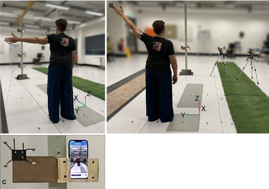Experimental setup. (A) shows the vertical iPhone setup. (B) shows the horizontal iPhone setup. (C) shows a detail of the phone holder and attached cluster with reflective markers. The phone holders were disconnected from the vertical post that was used in the vertical phone setup and were placed on top of the tripods (B). The global definition of the Vicon coordinate system, i.e., the , , -axes are shown in blue, green, and red, respectively.