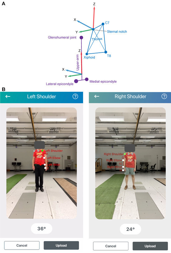 Anatomical reference frame definitions. (A) shows the anatomical axes definitions of the thorax and left upper arm viewed from the left-rear side. The anatomical axes were defined according to the International Society of Biomechanics. The thorax (in blue) anatomical axis system was defined as follows; the Z-axis was defined as the line that connects the mid-point between Xiphoid and T8 to the mid-point between Sternal notch and C7, the Y-axis is defined as a line that is perpendicular to the plane defined by mid-point between Xiphoid and T8, Sternal notch and C7. The X-axis is defined as a line that is perpendicular to the plane defined by the Y- and Z-axes. The upper-arm (in purple) anatomical axis system was defined as follows; the Z-axis is defined as a line that connects between the mid-point of the epicondyles of the humerus to the estimated glenohumeral joint centre. The X-axis was defined as a line perpendicular to the plane formed by the epicondyles and estimated glenohumeral joint centre. The y-axis was defined as a line perpendicular to the plane formed by the Z- and X-axes. (B) shows examples of 2D-pose from the skeletal tracking RoM of shoulder abduction of a left and right shoulder. The coloured circles reflect the identified body landmarks from the skeletal tracking algorithm; ipsilateral shoulder in green, contralateral shoulder and centre of shoulders in grey, arm landmarks in white, ipsilateral hip in red. Assessments were derived from the centred phone.