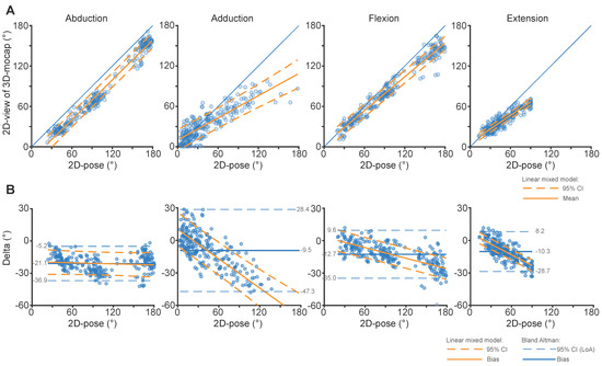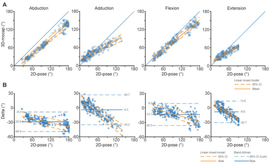 Comparison of thoraco-humeral abduction, adduction, flexion, and extension shoulder angles between 2D-pose-based RoM and 3D-Mocap from the centred phone using alternative Cardan sequence to decompose the 3D thoracohumeral angle. (A) shows scatter plots between 2D-pose-based (X-axis) and 3D-Mocap (Y-axis) derived shoulder angles. The blue diagonal line represents the line of identity. Data below or above this line reflect overestimation or underestimation of Skeletal Tracking RoM, respectively. The solid orange line represents the linear fit and the orange dashed lines represent the 95% confidence interval (CI) derived from the linear mixed models. (B) shows the Bland-Altman plots that correspond with the above scatter plots between 3D-Mocap and Skeletal Tracking RoM derived data. The y-axis represents the difference, or error (3D-Mocap—2D-pose RoM) of the shoulder angle and the x-axis represents the 3D-Mocap derived shoulder angle. Bias (solid blue line) and 95% limits of agreement (LoA, dashed blue lines) are displayed. The orange solid line represents the fit between 2D-pose and the difference between the 2D-pose-based and 3D-Mocap-based RoM, with 95% CI derived from the linear mixed models (dashed orange lines).