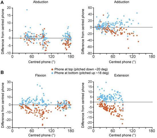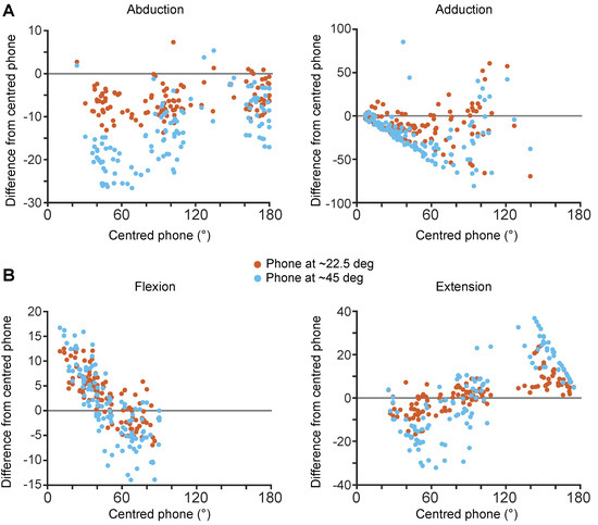 From visual inspection of the scatter plots in Figure 6, for abduction, both horizontally placed phones at ~45° compared to ~22.5° to the participant (Figure 1B) overestimated the RoM compared to the centred phone. Overestimation reduced towards larger abduction RoM. For the flexion and extension shoulder movements, the horizontally positioned phone measured larger or lower RoM than the centred phone depending on the RoM of the shoulder. For flexion, at low RoM, the horizontally placed phones underestimated at RoM ~<45° and overestimated ~>45°. For extension, at low RoM, the horizontally placed phones overestimated at RoM ~<90° and underestimated ~>90°. The adduction movement was challenging to assess with the phones positioned horizontally, especially at 45°. See Appendix A for methods to correct for out-of-plane phone alignment.