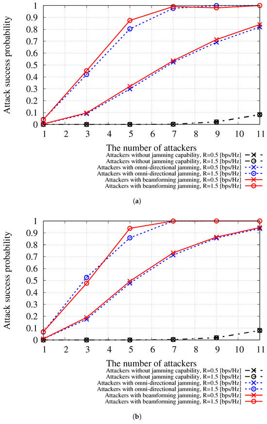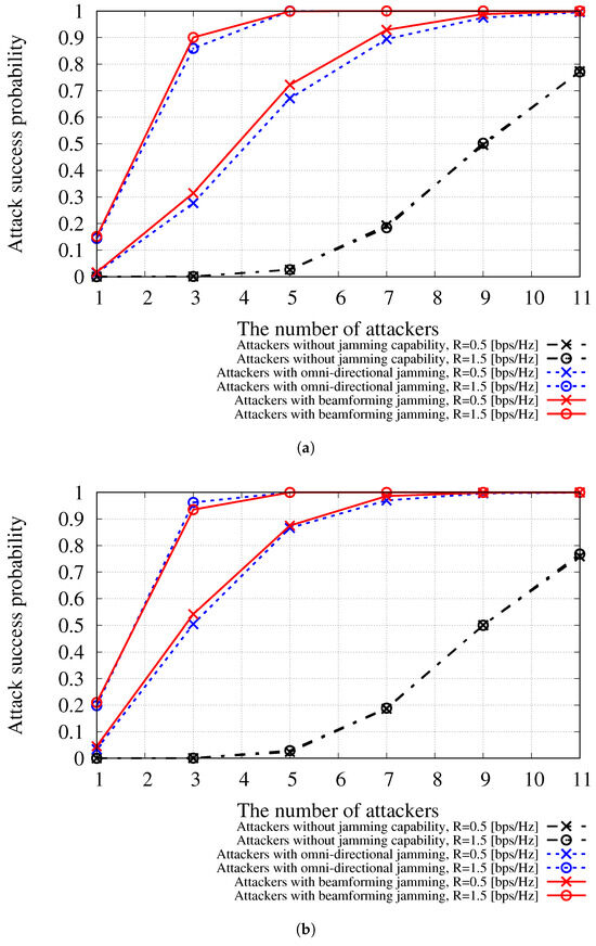 Figure 3 shows the attack success probability with respect to the number of attackers when and . As shown in Figure 3a, when attackers without jamming capability are deployed in the network, the attack success probability depends strictly on the number of attackers. Note that we assumed that the computing power of miners and attackers is the same for block generation; thus, the average attack success probability is 0.5 when there are nine attackers in the network. When attackers with jamming capability are deployed, they can achieve a higher attack success probability even when the number of attackers is less than the number of miners. As shown in Figure 3, beamforming jamming achieved slightly higher attack success probabilities than omnidirectional jamming. The simulation results imply that there could be significant performance degradation in BDFL-based wireless services when attackers have jamming capability. The simulation results also show that an increase in target probability may lead to a higher attack success probability because the outage probabilities for transmissions between non-attacker nodes such as normal miners or normal nodes increase. Figure 3b shows the results when Nth is increased to 7 compared to the results where Nth = 3, as shown in Figure 3a. In this case, because the miners need to gather more data to participate in BDFL, as calculated by Equations (9) and (10), higher outage probabilities are introduced compared to the results shown in Figure 3a.