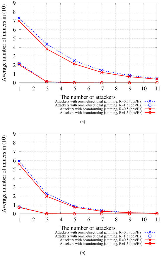 The simulation was implemented in MATLAB, and the simulation parameters are listed in Table 1. We assumed a network space of 100 × 100 for the simulations. Transmissions were performed at a carrier frequency of 2.4 GHz and attenuated with a pathloss exponent of 3 under the Rayleigh fading channel. The transmission power of normal nodes, normal miners, and attackers was equally 10 dBm for each. The target probability calculated by Equations (4) and (6) was set at bps/Hz. As the target rate increases, the required SINR for successful transmission increases, and eventually, the outage probability increases, as calculated by Equations (4) and (6). Attackers with jamming capability can employ either omnidirectional or beamforming jamming. Depending on the jamming strategy employed by attackers, the amount of mean interference toward normal nodes or miners calculated by Equations (7) and (8) is then determined. For beamforming jamming, the beamforming gain is added toward the channel gain toward the target. In the simulation, we assumed 10 dBi beamforming gain for jamming signals toward the attack target, as followed by [28]. Note that the beamforming gain of the jamming signals can be increased by narrowing the beam width. However, as the beam width narrows, the number of victim miners or normal nodes decreases depending on the network topology. In the simulation, we assumed a grid and uniform distribution of miners and normal nodes, respectively, to consider common network scenarios. Thus, we set the attackers to perform beamforming jamming on the nearest miner; otherwise, we performed omnidirectional jamming attacks.