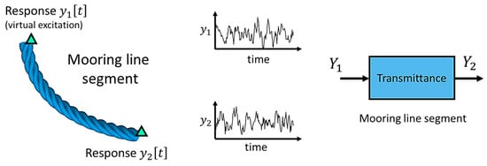 The TF resembles a typical Frequency Response Function (FRF), with the distinction that two separate output signals are used instead of a pair of input–output signals. To facilitate a better understanding of the TF functionality within the specific context of the current study, Figure 2 illustrates its application in modeling a mooring line segment. As depicted in the figure, two response signals are measured using accelerometers, one at each side of the segment. By designating one of the two measured signals as the excitation and the other as a response, it becomes possible to define a system that represents the relative admittance between the two measuring positions. The underlying idea for its application is that akin to a conventional FRF, the TF remains unaffected by the excitation variability while exhibiting high sensitivity to damage.