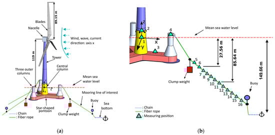 (a) The OO-Star Wind Floater Semi 10 MW FOWT and (b) the measuring positions on the synthetic fiber rope and the floater. The numerical labels alongside the measuring position symbols represent the corresponding measuring positions