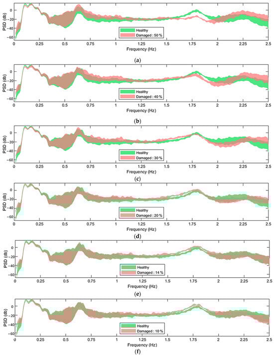 Welchbased estimates of the PSDs of acceleration signals corresponding to measuring position 11 in the x direction, under varying m/s and corresponding , (refer to Table 2), for healthy and damaged states: (a) damage level 50%; (b) damage level 40%; (c) damage level 30%; (d) damage level 20%; (e) damage level 14%; (f) damage level 10%. For the Welch estimate: Hamming Window; window size: 350; = 5 Hz; overlap: 95%; sample size .