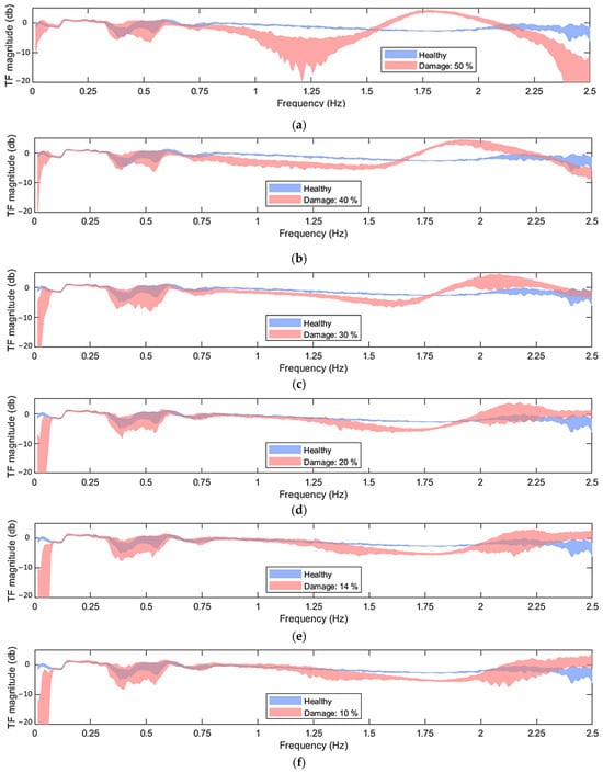 Based on Figure 5, and in comparison to the PSD shown in Figure 4, it becomes evident that the TF allows for a clearer distinction between healthy and damaged cases, even in instances of slight damage (see Figure 5e,f).