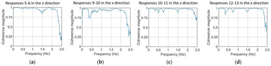Coherence function of acceleration signals in the x direction of measuring positions: (a) 5–6; (b) 9–10; (c) 10–11 and (d) 12–13. For the Welch estimate: Hamming Window; window size: 350; = 5 Hz; overlap: 95%; Sample size . Shown for a case under m/s.