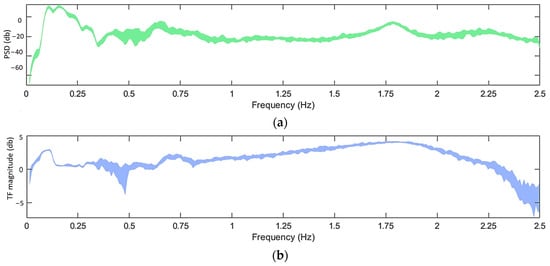 For the PSD and TF estimation, the Welch method was applied, utilizing a Hamming window with a window size of 350 samples and an overlap of 95%. The signals used had a length of samples and a sampling frequency of . The achieved frequency resolution is Hz, resulting in PSD and TF values for the criteria calculation.