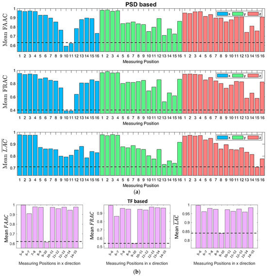 The mean values of the , , and are presented in Figure 8. It is shown that, using the PSD (see Figure 8a), there was agreement only between the and , pointing to the 10 and 11 positions in the x direction. On the contrary, with the utilization of the TF (see Figure 8b), all three criteria designated positions in the x direction as the optimal measuring locations.