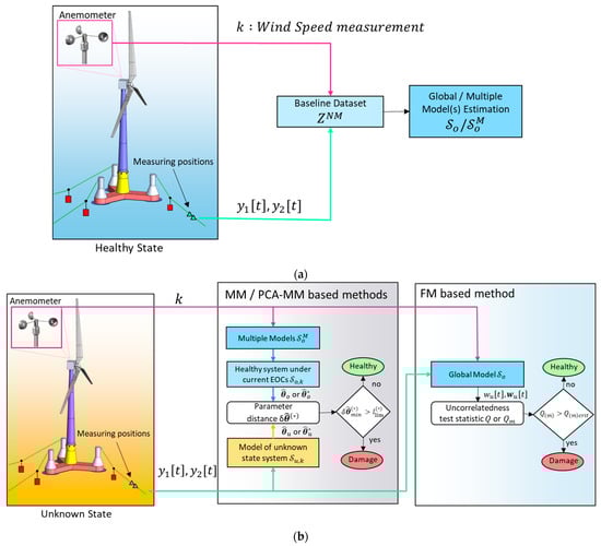 The current section includes a description of the baseline and inspection phases of the evaluated SHM methods. Six methods are employed: two MM-based methods, two PCA-based MM methods, and two FM-based methods. The two MM-based methods [28] are employed using either VAR models for the representation of the structural dynamics [24,25] or TF-ARX models [23]. The methods are abbreviated in these two cases as MM-VAR and MM-TF-ARX, respectively. The PCA-based MM methods, denoted as PCA-MM, represent a refinement or variant of the MM-based methods, introducing PCA parameter reduction before the detection process [28]. In accordance with the MM-based methods, two variants of the PCA-MM methods are examined: the PCA-MM-VAR and the PCA-MM-TF-ARX. Additionally, the FM-based methods [29,30,43,44,45] are employed utilizing either an FP-VAR [45] or an FP-TF-ARX [30,44] model and are, therefore, abbreviated as FM-VAR and FM-TF-ARX respectively. All six methods are trained using pairs of signals that are collected under healthy FOWT operation, with varying EOCs during the baseline phase (see Table 1). It is noted that the varying EOCs characterized by (see Section 2.3) are measurable in both baseline and inspection phases.
