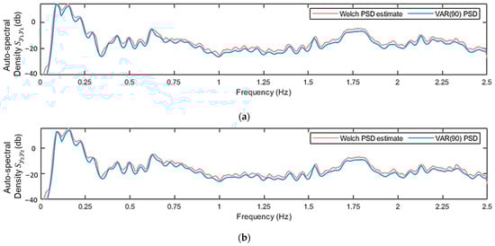 where , the AR and X orders of the model, and the AR and X parameters, and the model’s residuals, which ideally is a zero-mean white noise signal following an iid normal distribution with variance . The model estimation, similar to the VAR model, is performed using OLS (see Equation (10)). To do so, the parameter vector , the regression matrix and the signal vector should be structured appropriately [22] (pp. 203–204). The estimated parameters covariance matrix is, in this case, given by [22] (pp. 551–553):