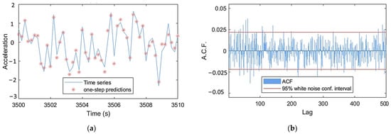TF-ARX(90,90) model validation: (a) one-step predictions and (b) residual signals’ Autocorrelation Function (ACF). Shown for healthy case under m/s.
