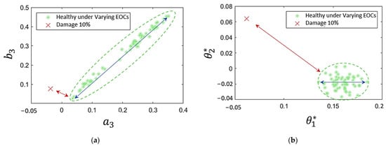 To reduce the parameter subspace dimensionality with the PCA-MM methods, a decrease in variability of was considered [28], which led to the selection of 135 components for the TF-ARX models and 314 components for the VAR models out of their original 181 and 360 parameters, respectively. The advantage of the PCA-MM over the simpler MM-based methods is demonstrated in Figure 14. In the figure, two scatter plots are compared, representing each condition with two TF-ARX parameters (see Figure 14a) and with two of the selected principal components (see Figure 14b). The performance of each method depends on the parameters’ or principal components’ sensitivity to damage and to EOCs. In Figure 14, the sensitivity to damage is highlighted by the minimum distance between damaged and healthy states (red arrows), while the sensitivity to EOCs is highlighted by the maximum distance between cases of the healthy state (blue lines). It is shown that in the MM-based method (see Figure 14a), the sensitivity to EOCs (blue arrows) is much higher than the sensitivity to damage (red line), while the opposite holds true for the PCA-MM method (see Figure 14b).