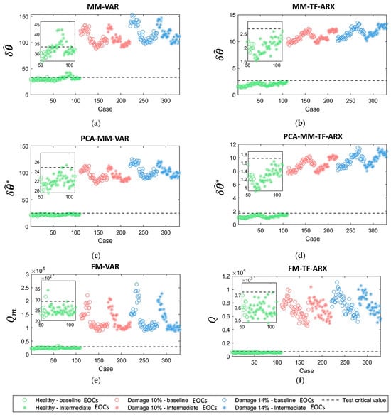 Damage detection results based on the method variations: (a) MM-VAR; (b) MM-TF-ARX; (c) PCAMM-VAR; (d) PCA-MM-TF-ARX; (e) FM-VAR; (f) FM-TF-ARX. Critical values correspond to three standard deviations from the healthy baseline -based metric distributions. Results of (a,c,e) correspond to measuring positions 10–11 and (b,d,f) to 9–10.