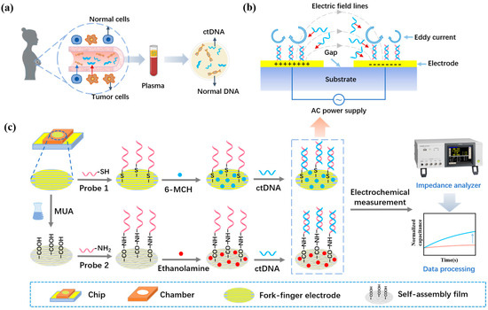 The chip was placed in the UV ozone cleaner for 20 min before the modification of the probe to increase the oxygen negative ion content on the electrode surface, thus increasing the hydrophilicity and enabling the probe to be better adsorbed on the gold electrode surface. In this paper, two methods were used to immobilize the probe, as shown in Figure 1c. One is to immobilize the probe by Au–S bonding, which is incubated by adding 20 μL of sulfhydryl-modified probe solution dropwise directly on the electrode surface. After the incubation of the probe was completed, 10 µL of 6-MCH solution was added dropwise to close the sites not bound to the probe and prevent impurities from binding non-specifically to the electrode during ctDNA detection. The other is to immobilize the probe by amide bonding. Before immobilizing the probe, the chip needs to be immersed in MUA solution to form a dense MUA self-assembly film on the electrode surface. Then EDC and NHS solution were mixed in a ratio of 1:4 by volume to activate the carboxyl group at one end of the self-assembled membrane. The activated self-assembled membrane can be bound to the amino-modified probe via amide bonding. After the probe was fixed, 10 µL of ethanolamine solution was added dropwise to the lumen as a closure solution to prevent non-specific binding during the assay. After these steps, two specifically functionalized ctDNA biosensors were prepared. Finally, a specific AC electrical signal was applied at both ends of the electrodes, and then ctDNA solution was added dropwise to the electrode surface with the probe fixed on the electrode surface for quantitative detection.