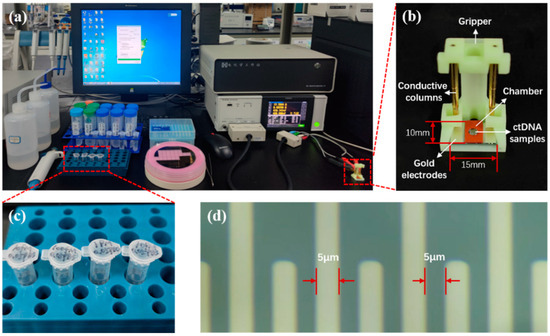 (a) Equipment and reagents for ctDNA electrochemical measurements. (b) ACEK biosensor and its fixation device. (c) 10 fM, 100 fM, 1 pM, and 10 pM ctDNA samples. (d) Forked-finger gold electrodes under the microscope.