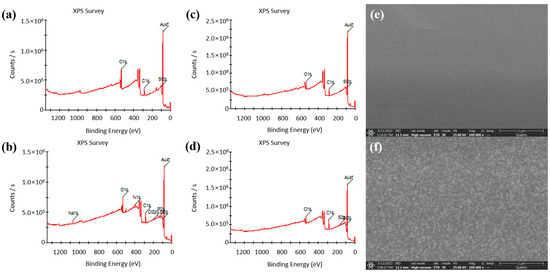 (a) XPS full spectrum of the chip surface before the probe was fixed by Au–S bonding. (b) XPS full spectrum of the chip surface after the probe was fixed by Au–S bonding. (c) XPS full spectrum of the chip surface before the formation of self-assembled film. (d) XPS full spectrum of the chip surface after the formation of the self-assembled film. (e) SEM image of the electrode surface before the formation of the self-assembled film. (f) SEM image of the electrode surface after the formation of the self-assembled film.