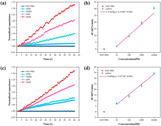 To obtain the best detection performance of the sensor, a chip with a size of 5 µm × 5 µm was chosen, and the frequency and voltage of the applied AC signal were set at 20 kHz and 300 mV, respectively. Briefly, 10 fM, 100 fM, 1 pM, and 10 pM ctDNA solution and 0.05 × PBS were detected, and 0.05 × PBS was used as a blank control. The detection results of the method of Au–S bonding immobilized probes and the method of amide bonding immobilized probes are shown in Figure 4. Figure 4a,c shows the curves of normalized capacitance with time for the two methods detecting four concentrations of ctDNA solution. The normalized capacitance increases with time over 1 min. In addition, the normalized capacitance increases with increasing concentrations of ctDNA solution. It means that the amount of ctDNA bound to the probe increases. Figure 4b,d shows the linear fit curves of the normalized capacitance rate of change versus concentration obtained from the two methods detecting four concentrations of ctDNA solution. In the concentration range of 10 fM–10 pM, the normalized capacitance rate of change exhibited a logarithmic dependence on the solution concentration .