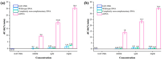 The specificity of two biodetectors for breast cancer ctDNA was evaluated by comparing the rate of capacitance change of ctDNA samples using two biosensing strategies. Wild-type DNA solution and completely non-complementary DNA solution at concentrations of 100 fM, 1 pM, and 10 pM were detected by two methods, with 0.05 × PBS as a blank control. The test results are shown in Figure 5. The normalized capacitance change rates of even wild-type DNA solution and fully non-complementary DNA solution with concentrations up to 10 pM are much smaller than those of ctDNA solution with 100 fM. The rate of normalized capacitance change was much smaller than that of the ctDNA solution at 100 fM. Therefore, the biosensor is highly specific for ctDNA, and its non-specific adsorption is negligible.