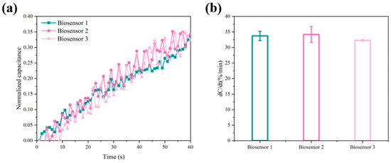 The reproducibility of the biosensor was verified by three different biosensors using the method of amide bonding immobilized probes, and three detection experiments were performed on 10 pM ctDNA samples with 0.05 × PBS as background solution. The normalized capacitance values obtained from the experiments are shown in Figure 6a, and the normalized capacitance change rates for the three cycles were 33.73%, 34.20%, and 32.47%, respectively (Figure 6b). The biosensor has excellent reproducibility, and the difference in response between the three biosensors was within 1.73%.