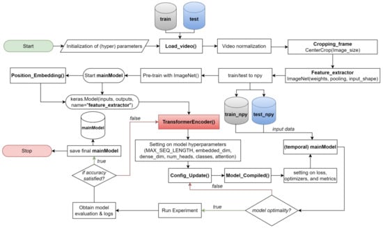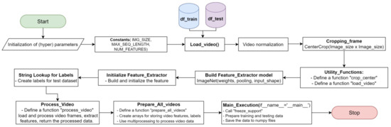 This approach optimizes both processing time and the utilization of parallel processing capabilities. Furthermore, we construct a feature extractor model based on the architectural insights from the ImageNet models (DenseNet121, ResNet50, VGG16, and VGG19), complemented by creating a label vocabulary for the test dataset. In our video processing pipeline, we employ specialized functions for frame processing and feature extraction, utilizing multiprocessing techniques. During frame processing, each frame undergoes specific operations, including a random rotation of up to 70 degrees and a random shift of 224 × 224 pixels. Simultaneously, feature extraction is conducted in parallel on multiple frames, harnessing multiprocessing to improve efficiency. This methodology is crafted to optimize computational resources and minimize processing time. Lastly, the main execution section, triggered by the ‘if __name__ == ‘__main__’,’ condition, encompasses data preparation for both training and testing, with dimensions clearly defined and the processed data saved as NumPy files.