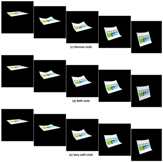Lastly, ‘Stiffness’, commencing at 0.1 and reaching up to 1.0, governs the material’s rigidity or flexibility. Augmented stiffness values confer greater resistance to deformation, yielding a stiffer appearance, while diminished values foster enhanced flexibility and deformability within the material. In video dataset simulation, as shown in Figure 4, we defined a ‘stiffness’ scale ranging from 0.1 to 1.0, with 0.1 representing very soft cloth, 0.25 for soft cloth, 0.50 for normal cloth, 0.75 for stiff cloth, and 1.0 for very stiff cloth.