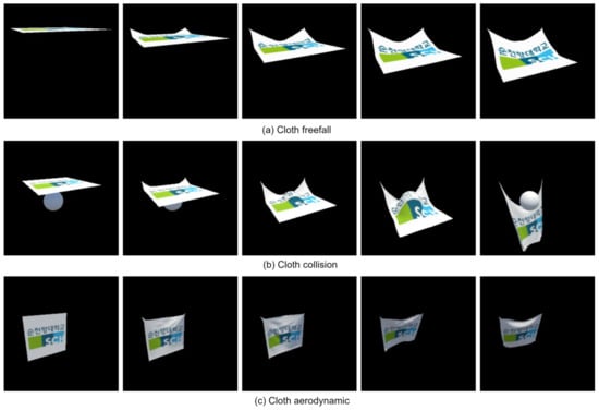 In Figure 6, the depicted object was generated through computer simulation employing the PBD method as part of our experimental process, encompassing the simulation of cloth freefall, cloth collision, and cloth aerodynamics.