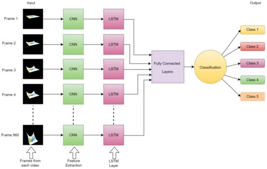As previously mentioned, LSTM models incorporate specialized memory cells that possess the ability to retain or discard information selectively as time progresses. This functionality is achieved through the utilization of three primary components: the input gate, responsible for determining the amount of new information to be stored in the memory cell; the forget gate, which controls the removal of past data from the cell; and the output gate, regulating the transfer of information from the memory cell to the subsequent time step. This gate-based mechanism empowers LSTMs to effectively capture and retain long-term dependencies while simultaneously addressing the challenge of the vanishing gradient problem. In video classification, the LSTM model can be sequentially applied to analyze the frames or segments of an image or video. By examining the temporal cues inherent in the video sequence, the LSTM model can learn and identify patterns, motion, and persistent temporal dynamics, as shown in Figure 9, which are crucial for achieving accurate video classification.