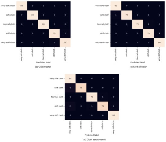 Confusion Matrix from our experiment datasets (a) cloth freefall, (b) cloth collision, and (c) cloth aerodynamics.