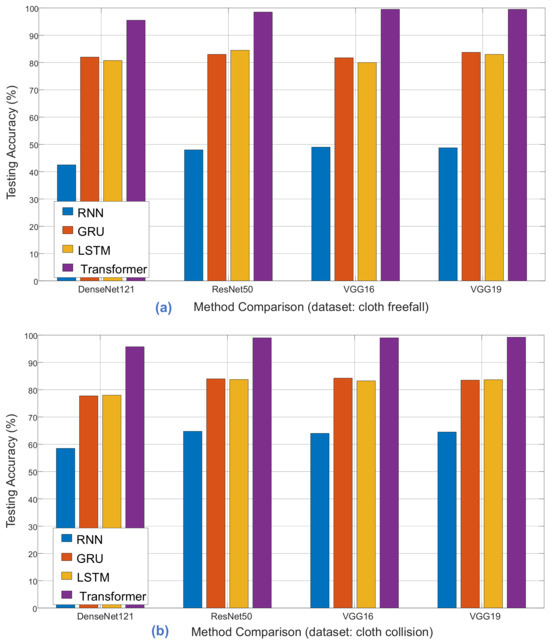 Classification accuracy comparison with RNN, GRU, LSTM, and Transformer models (cloth freefall).