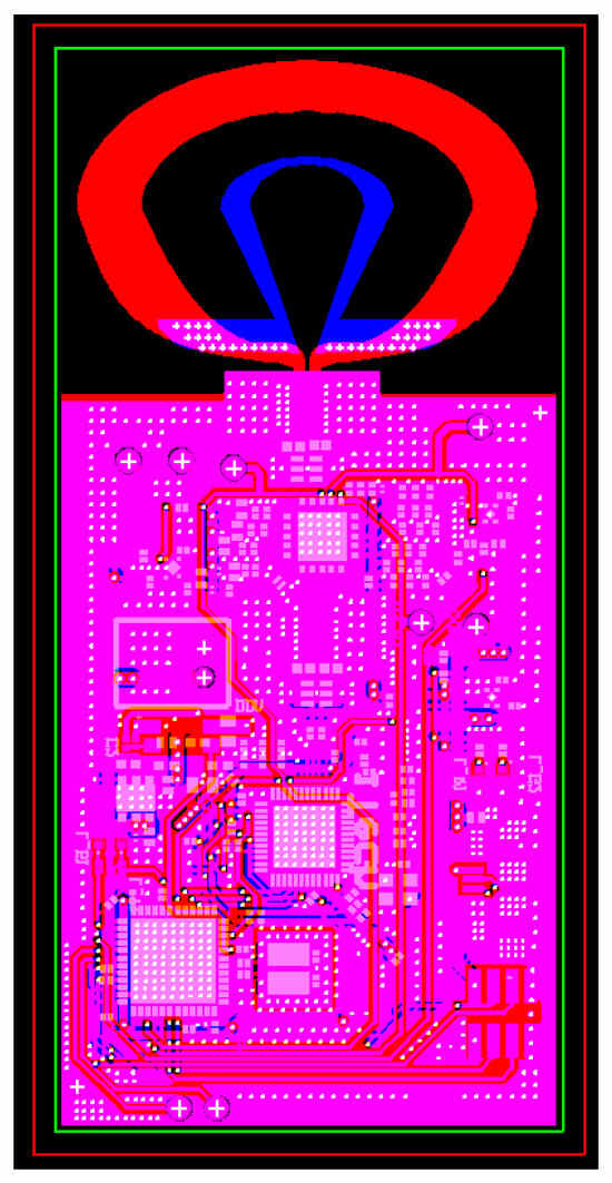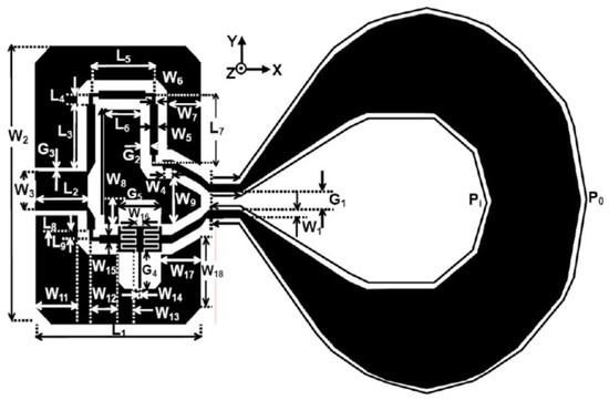 After optimized design, the antenna integrates a large tapered loop antenna and a small tapered loop antenna, connected at the end by a metal via. The larger tapered loop antenna, positioned on the upper layer, controls low-frequency components, as shown in Figure 5. Meanwhile, the smaller tapered loop antenna on the lower layer manages high-frequency components, as illustrated in Figure 6. Design parameters are detailed in Table 2.
