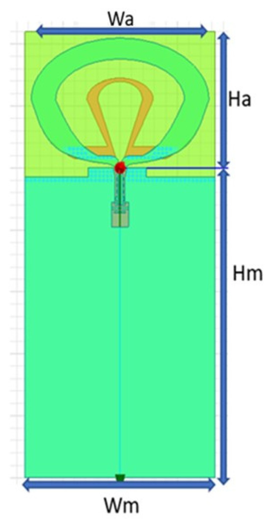 This design introduces a dual-band dual-loop antenna for a UWB positioning system, depicted in Figure 4. To better align with practical application requirements, the design takes into account the connected rear module and employs a four-layer FR4 board for simulation. The overall dimensions of the antenna are 21 × 31 (Ha × Wa) mm, and the total size, including the module, is 71 × 33.6 ((Ha + Hm) × Wm) mm. The antenna design is based on the concept of a tapered loop antenna, adjusting radius sizes and curvature to control the impedance bandwidth and radiation pattern. In order to ensure that the optimal antenna design can be obtained during antenna design, the objective function will be used to comprehensively evaluate the characteristics of the antenna.