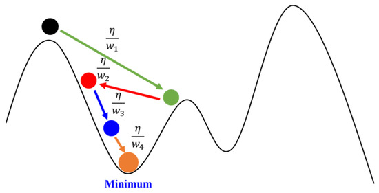 Adagrad is an Adaptive Gradient algorithm, where the distance of travel along the gradient continuously decreases with the number of iterations, as illustrated in Figure 12. Typically, in the gradient descent method, the distance from the extremum is relatively far at the beginning, leading to relatively larger movements. However, as the number of iterations in the gradient descent increases, it gradually approaches the extremum. Therefore, it is necessary to continually reduce the distance of movement to approach the extremum without oscillating back and forth due to excessive movement distance.