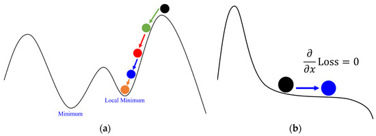 However, because the speed of parameter updates in Adagrad slows down as the number of iterations increases, it eventually becomes unable to approach the true extremum due to the slow movement, getting trapped in a local extremum, as shown in Figure 13a. Alternatively, it may get close to zero, causing the gradient descent method to be unable to approach the extremum, as depicted in Figure 13b. To address the issues of Adagrad getting stuck in local extrema and approaching zero, another common adaptive gradient method, Adam optimization, has emerged.