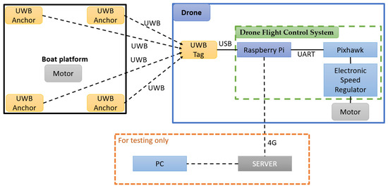Figure 15 illustrates the system architecture. We constructed a 3 m × 3 m platform on the ship for UAV landing, installing homemade UWB Anchor modules at the four corners of the landing platform.