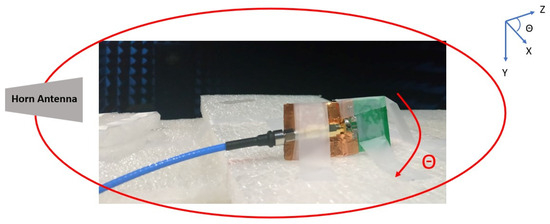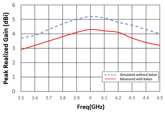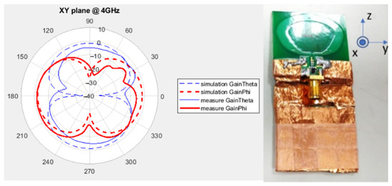 The gain and radiation pattern were measured using NSI2000 (NSI-MI Technologies, Suwanee, GA, USA) in an anechoic chamber, and the results are depicted in Figure 16. In simulations, the gain remains approximately 5 dB across the entire operating frequency band. In actual measurements, the gain trend aligns with the simulation results. However, there is a 1 dB gain discrepancy between measurements and simulations attributable to the imperfect characteristics of the balun’s loss. Figure 17 illustrates a comparison between the measured and simulated radiation patterns at 4 GHz. The XZ plane exhibits a more uniform radiation pattern and polarization direction that remains consistent with rotation.