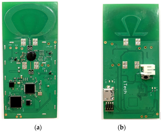 As shown in Figure 7, we finally designed an integrated module, including antenna, RF circuit, Serial Peripheral Interface (SPI), Power Management Integrated Circuit (PMIC), IMU, and crystal oscillator. The connections between the antenna, RF front-end module, and individual UWB chips are illustrated in Figure 8 of the circuit diagram. When used with a microcontroller, it can use two-way ranging (TWR) to achieve precise distance calculations [23], making it ideal for real-time location systems (RTLS). This module can configure various parameters through SPI communication through the microcontroller, including data transfer rate, data length, transmission power, UWB channel, preamble and other settings that can be adjusted according to the application scenario. It has a high-precision clock that accurately obtains the timestamp of received packets. Using TWR technology, the TOF of signal transmission can be accurately calculated. In addition, it can capture key parameters such as channel impulse response (CIR), which helps explore the environment through UWB signals and correct ranging errors when non-line-of-sight (NLOS) conditions occur [24,25,26].