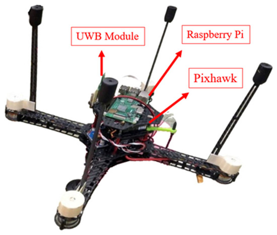 Our drone is self-assembled and weighs approximately 750 g, Figure 24 shows the actual assembled UAV communication system hardware, including the UWB tag module, Raspberry Pi, and Pixhawk. To ensure flight safety, they are all installed on the bottom of the UAV. In order to enable the UWB tag module to communicate stably, the UWB tag module is fixed at the bottom and the antenna is perpendicular to the ground. At the same time, the length of the drone’s landing gear is designed to be longer than the UWB tag module antenna to prevent the antenna from touching the ground when landing.