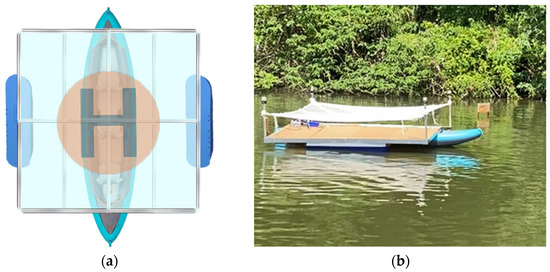 The concept of vessel structure design primarily considers the stability of the platform under the vessel’s motion. To reduce swaying and enhance the load-carrying capacity of the aluminum extrusion structure, the design incorporates an inflatable canoe combined with aluminum extrusions and acrylic panels to form a landing platform. Due to the canoe’s width being only 102 cm, while the installed platform measures 300 × 300 cm, it is prone to a shift in the center of gravity during navigation, leading to swaying and potential misjudgments or submergence of unmanned drones. To avoid this scenario, the design incorporates an auxiliary float on each side of the vessel to increase the platform’s stability, as depicted in Figure 27a, while Figure 27b illustrates the final operational appearance of the vessel’s structure.