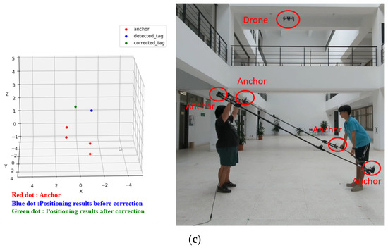 To validate the positioning compensation effect of this system on the floating platform, we simulated the floating platform using a 2 m × 2 m square tool. Positioning modules were installed at the four corners, and the tool was operated by two individuals to simulate horizontal and side-to-side tilting. The test results are depicted in Figure 28, where the red dot represents the positioning module, and the blue dot denotes the positioning module. The positioning result before compensation is represented by the red dot, while the green dot represents the positioning result after compensation. Figure 28a illustrates the platform level test, showing a stable anchor point directly above the platform. Figure 28b,c depict left and right tilt tests of the platform, respectively. It is evident that the positioning point is noticeably offset before compensation, while the positioning point after compensation is closer to the correct drone position. This test confirms that the positioning system effectively corrects positioning errors caused by the tilt of the landing platform due to waves.