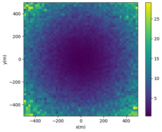 We simulated the positioning accuracy using the actual statistical standard deviation. However, there are other factors that can affect the positioning accuracy in real environments. We simulated the positioning scenario using a program, setting the landing area as 10 m × 10 m, with anchors placed at the four corners of the landing area. The Tag’s position was set as follows: ~[−500 m, 500 m], ~[−500 m, 500 m], and = 100 m, with intervals of 10 m between each point. Each point was simulated 20 times, with each simulation introducing an error equal to the correct distance plus a standard deviation of 0.04 m. This value was derived from actual measurement data statistics. Figure 29 illustrates the simulation results, with colors representing the root mean square error value. Table 4 compares the distance between the tag and the origin, the simulated positioning error, and the actual positioning error.